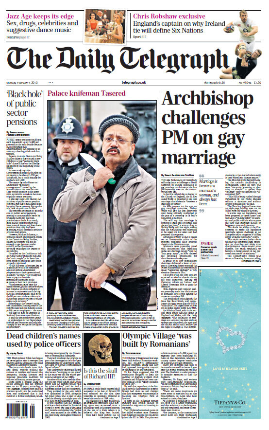 Update: Some good news: The Telegraph is running with the headline 'Archbishop Challenges Government on Gay Marriage'.